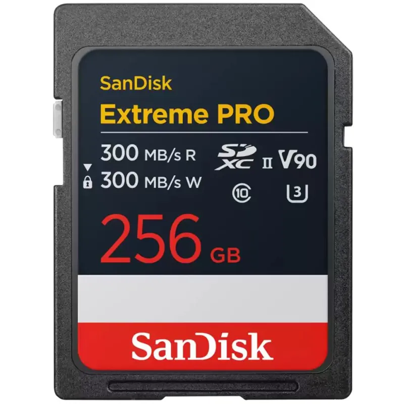 Tarjeta SD: SanDisk Extreme PRO UHS-II V90 256 GB para vídeo 8K/4K y foto RAW; hasta 300 MB/s y V90. Compatible con UHS-I, rinde más con lector UHS-II.