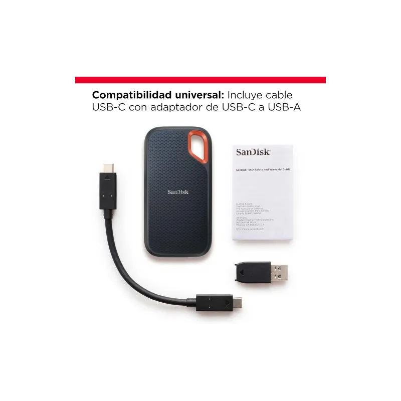 Disco Duro SSD SanDisk SDSSDE61-2T00-G25B con velocidad de lectura 1050 MB/s, escritura 1000 MB/s, conector USB Tipo C y certificación IP65.