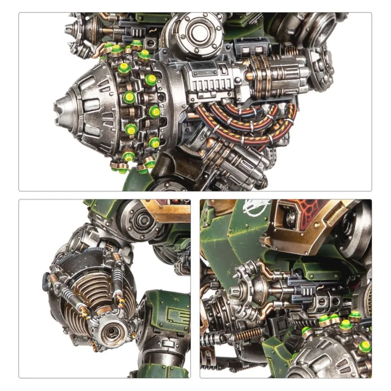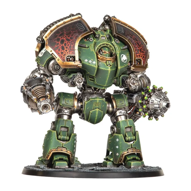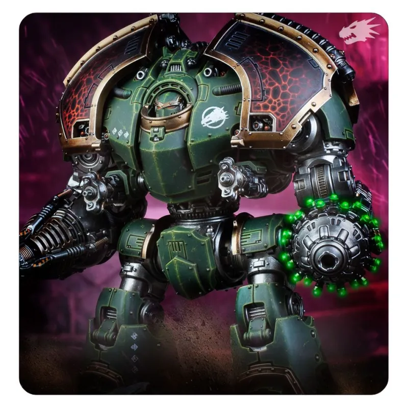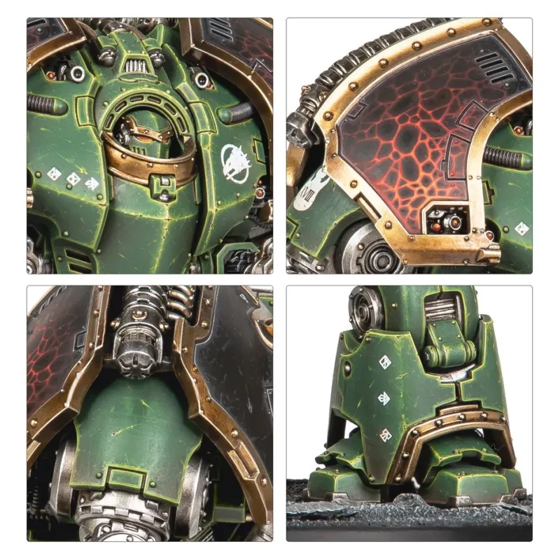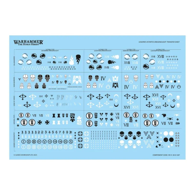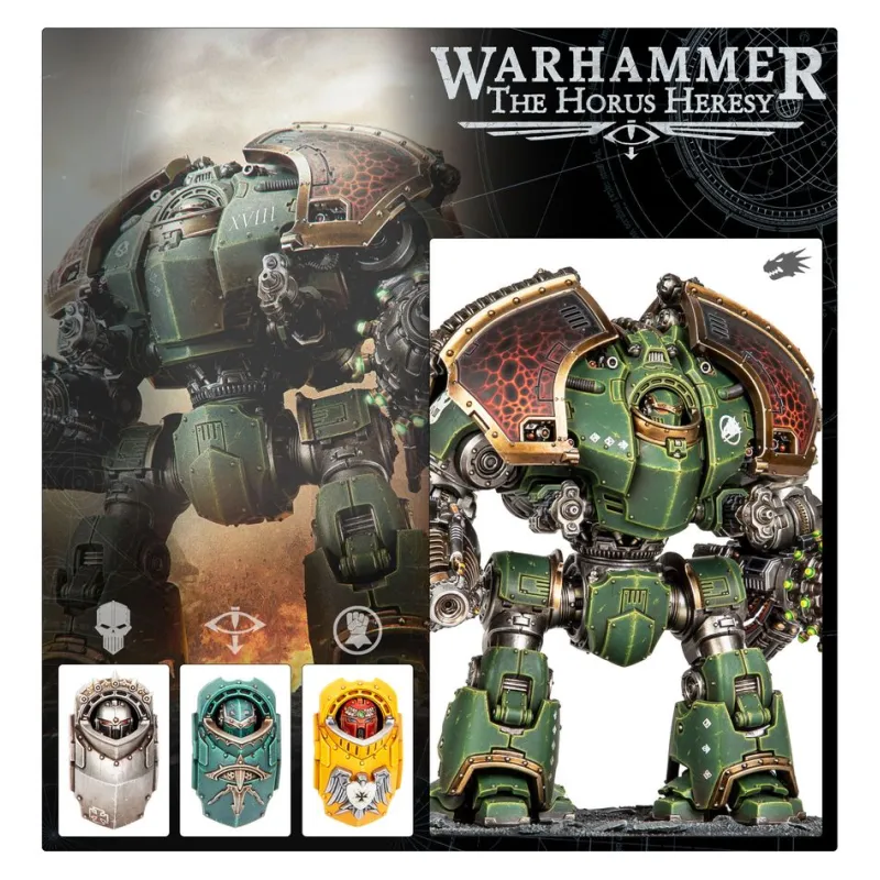 - Componentes: 213 piezas de plástico, 1 peana redonda Citadel de 100 mm y una hoja con 528 calcomanías al agua de gran calidad para los Dreadnoughts, con iconografía de las Legiones de Sons of Horus, Imperial Fists, Iron Warriors y Salamanders