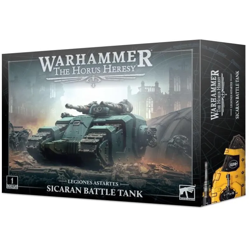 Este kit de plástico multipartes construye un Tanque de Batalla Sicaran, un vehículo de alta velocidad armado con un conjunto de cañones automáticos aceleradores montados en torreta. El Sicaran también cuenta con un bolter pesado montado en el casco, así como un par de armas en afuste lateral: tu elección de bolters pesados, lanzallamas pesados, cañones láser o culverinas volkite. El kit incluye componentes para mejorar este vehículo con un arma montada en afuste: un lanzador de estragos, bolter pesado, lanzallamas pesado, multi-melta o un arma combinada con cinco configuraciones (bolter, lanzallamas, melta, plasma o volkite), así como un reflector, un misil cazador-asesino y opciones cosméticas como ganchos de remolque, una hoja topadora y la elección de un artillero de los Marines Espaciales, un observador o una escotilla cerrada.