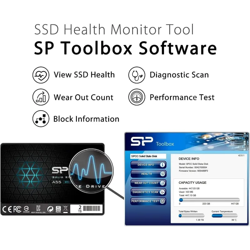 DESCARGA GRATUITA DEL MONITOR DE SALUD DEL SSD - SP TOOLBOX: Monitorea fácilmente la salud de tu nuevo SSD con nuestro software de descarga gratuita – SP Toolbox. Realiza pruebas de rendimiento en el Ace A55, obtén una evaluación general de funciones o verifica información detallada sobre tu dispositivo, incluyendo espacio usado, temperatura del dispositivo, bytes totales escritos y mucho más.