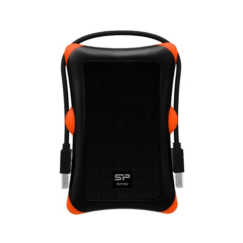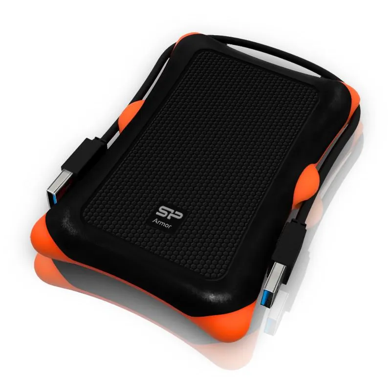 Caja para disco duro externo Silicon Power Armor A30 Negro con versión USB 3.2 Gen 1, alimentación por USB y diseño resistente en negro y naranja