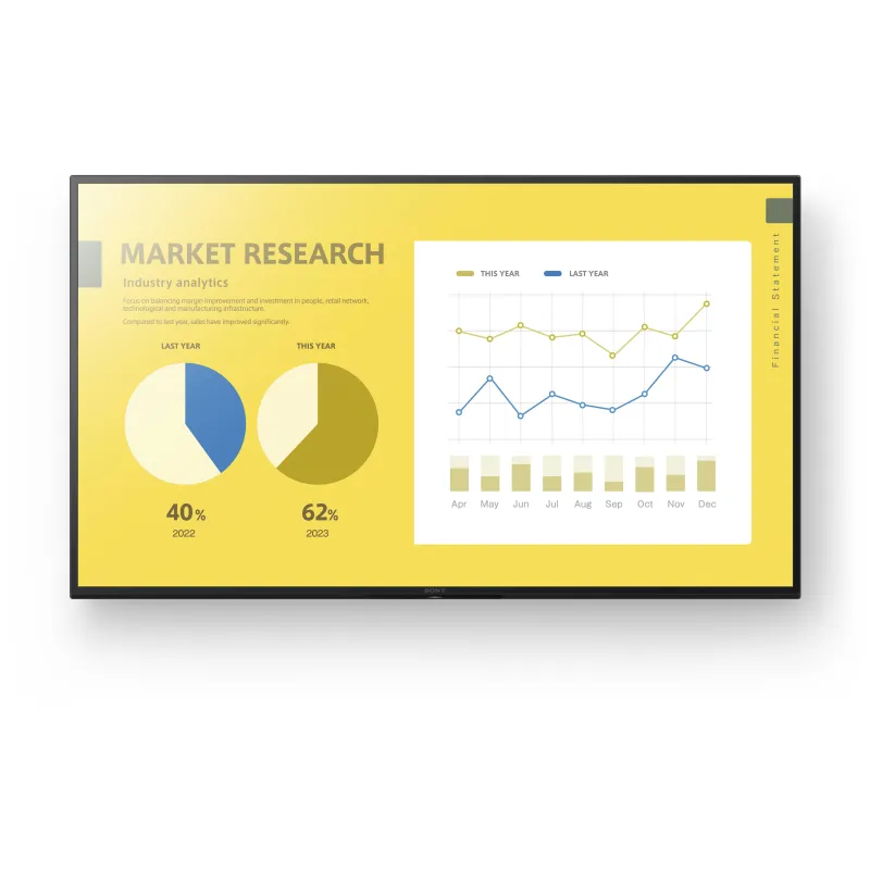 EFICIENCIA Y TECNOLOGÍA EN UN SOLO DISPOSITIVO: La Pantalla Interactiva Sony FW-50EZ20L combina eficiencia energética con un rendimiento visual de alto nivel. Con un consumo de solo 140 W en funcionamiento y 0,5 W en reposo, resulta una opción eficiente para uso continuo. Su pantalla 4K y retroiluminación Direct-LED garantizan una calidad de imagen superior sin comprometer el consumo energético. Además, incorpora un sistema operativo Android con 16 GB de almacenamiento interno, lo que permite ejecutar aplicaciones directamente desde la pantalla. Esta combinación de características técnicas la convierte en una herramienta completa para presentaciones, publicidad o señalización digital en entornos corporativos, educativos o comerciales.