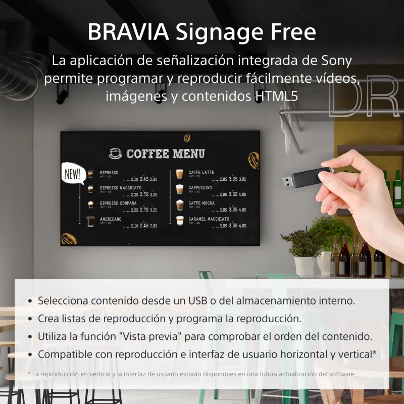 SEÑALIZACIÓN HECHA SIMPLE: El soporte integrado para HTML5 facilita la visualización de contenido de señalización interactiva en BRAVIA sin la necesidad de un decodificador dedicado, reproductor multimedia o PC. La aplicación BRAVIA Signage Free (BSF) 2.0 a bordo reproduce automáticamente contenido HTML, incluidos videos y fotos desde el almacenamiento interno de 16GB de la pantalla, o cuando se inserta una memoria USB en BRAVIA.