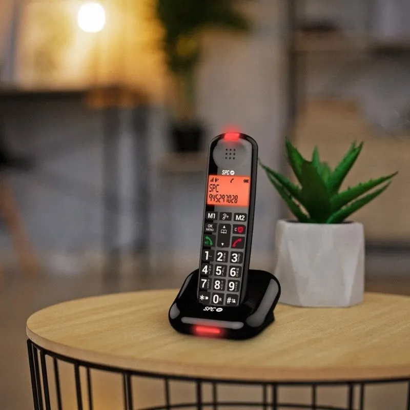 Teléfono inalámbrico ideal para personas mayores. Con 5 funciones antispam, botones grandes, pantalla y teclas retroiluminadas, 2 memorias directas y volumen extra en auricular. Es compatible con audífonos, incluye modo mute y permite bloquear hasta 100 números.