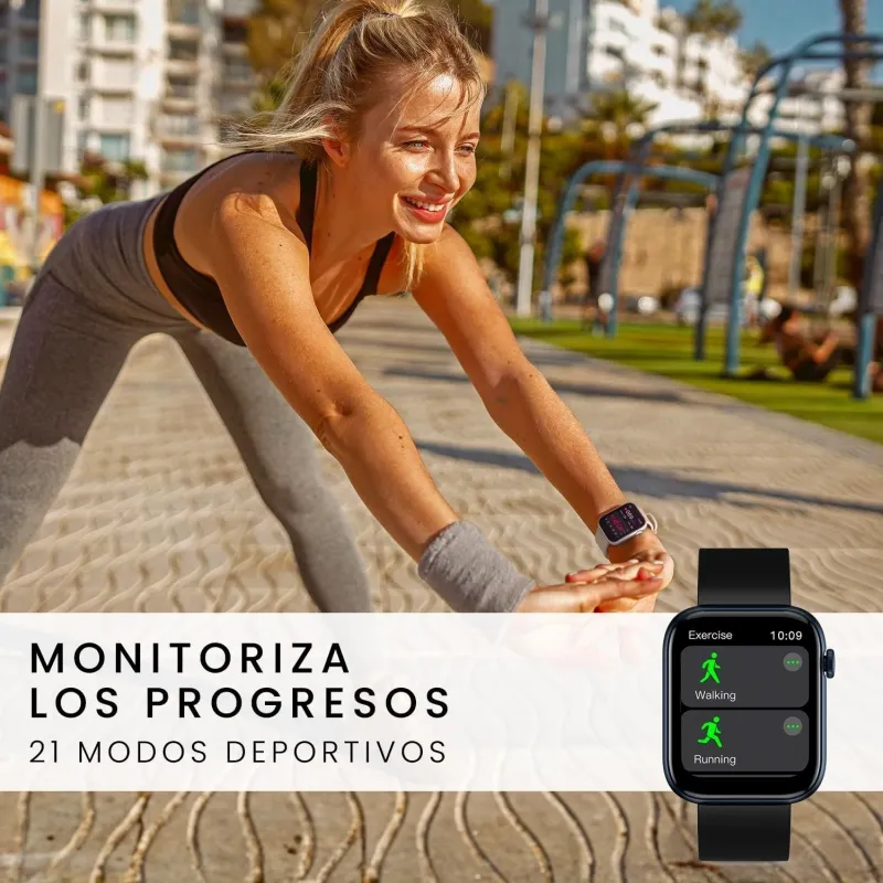 TE ACOMPAÑA EN TU ACTIVIDAD FÍSICA: Si eres de los que les gusta moverse y practicar deporte, este reloj es para ti. Tiene 21 modos deportivos para que puedas registrar tus entrenamientos y tus resultados. Podrás medir el tiempo, la distancia, las calorías, la frecuencia cardíaca y otros parámetros de cada actividad. Ya sea caminar, correr, nadar, ciclismo, yoga o cualquier otro deporte que te apasione, este reloj te ayudará a mejorar tu rendimiento y a alcanzar tus objetivos.