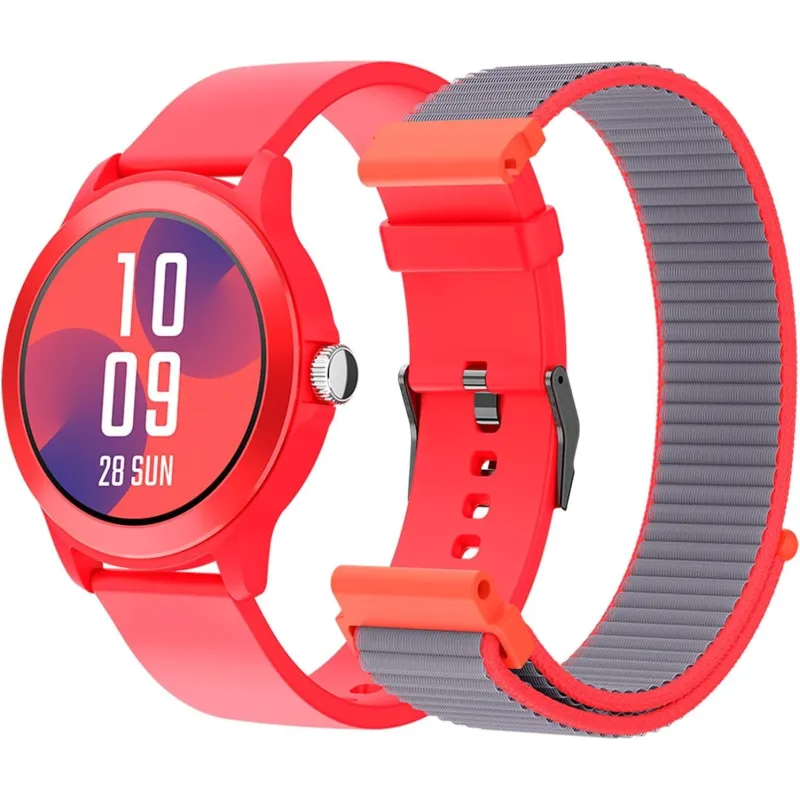 SMARTWATCH DE 1,27” CON PANTALLA TÁCTIL DE ALTA DEFINICIÓN: 3 colores disponibles, 2 correas intercambiables de nylon y silicona, llamadas y avisos Bluetooth, 100 modos deportivos, batería para 8 días y protección IP68.
