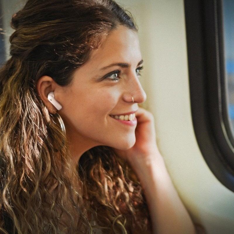 Auriculares True Wireless con diseño ultracompacto, muy ligeros y un estuche de carga miniatura capaz de proporcionar hasta 28 h de autonomía. Incluyen control táctil y compatibilidad con asistentes de voz.