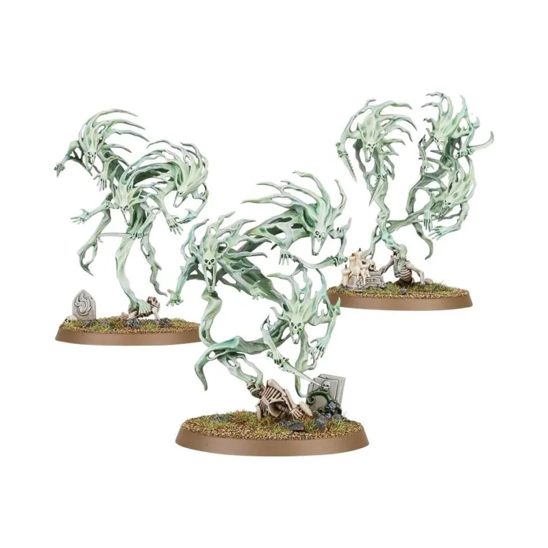 Las miniaturas representan grupos de espíritus enredados entre sí, con siluetas alargadas y movimiento muy marcado, lo que ayuda a transmitir la sensación de marea espectral avanzando por el campo de batalla y refuerza el aspecto temático de cualquier ejército de la Muerte.