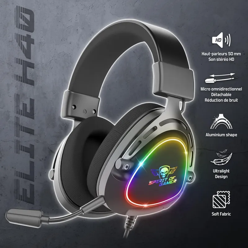 Auriculares Spirit of Gamer Elite H40 con auricular de 50 mm, retroiluminación LED azul y micrófono omnidireccional