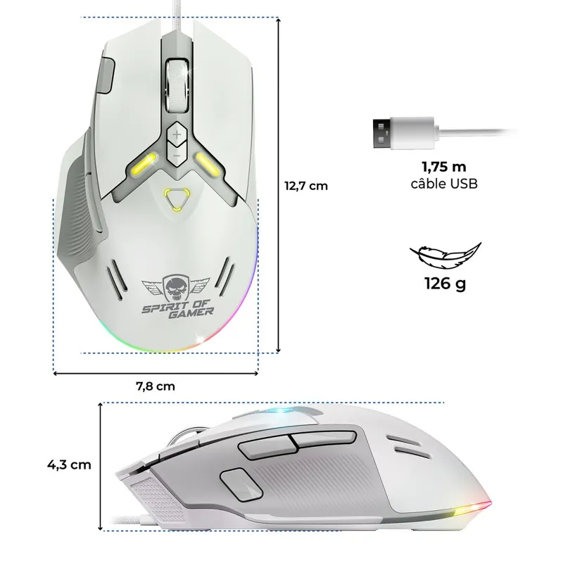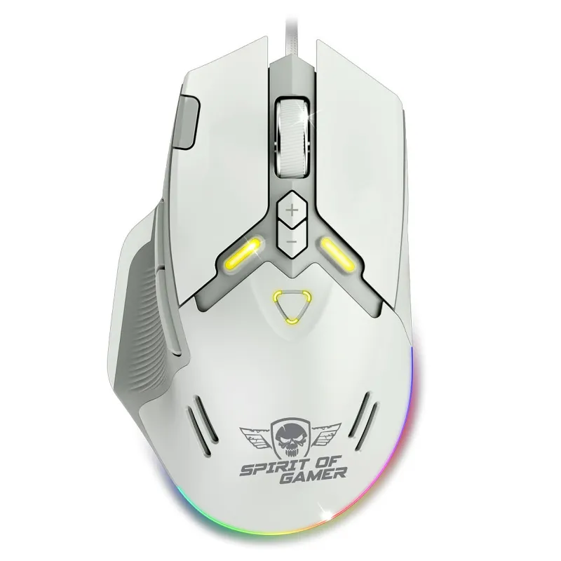 Es un ratón gaming en color blanco con iluminación RGB de la serie Elite M60 de Spirit of Gamer.