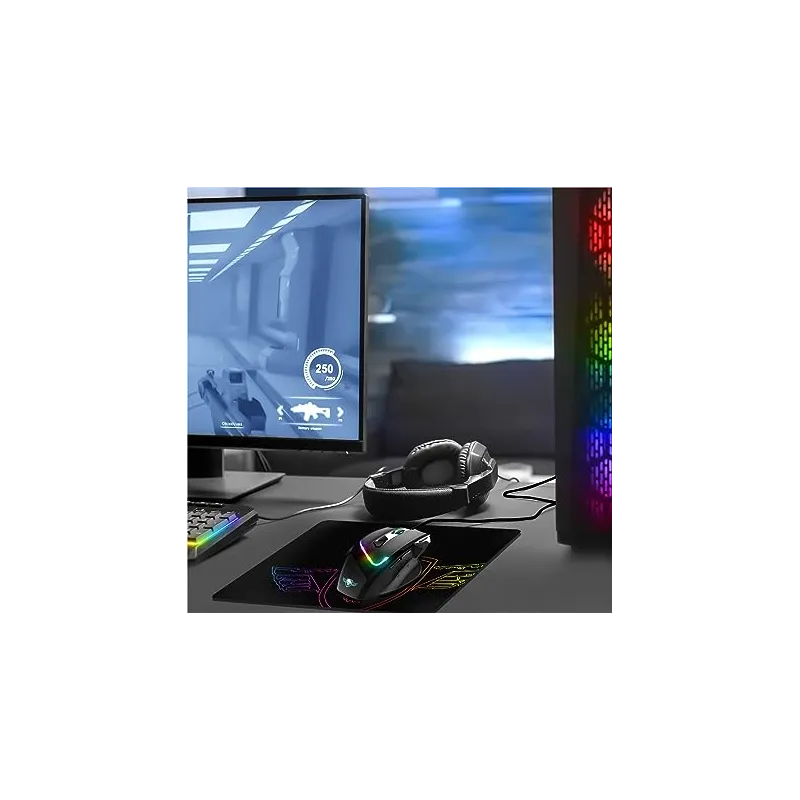 MÁS OPCIONES Y FUNCIONES: Tiene 8 botones programables, que te permiten personalizar las funciones del ratón según tus preferencias o el juego. También tiene una iluminación RGB, que te permite elegir entre 12 efectos preestablecidos o crear los tuyos propios. Y tiene un botón RGB dedicado, que te permite activar o desactivar la iluminación cuando quieras. La alfombrilla tiene una superficie cómoda y estable para deslizar el ratón, y se sincroniza con la iluminación del ratón para crear un ambiente de juego único.