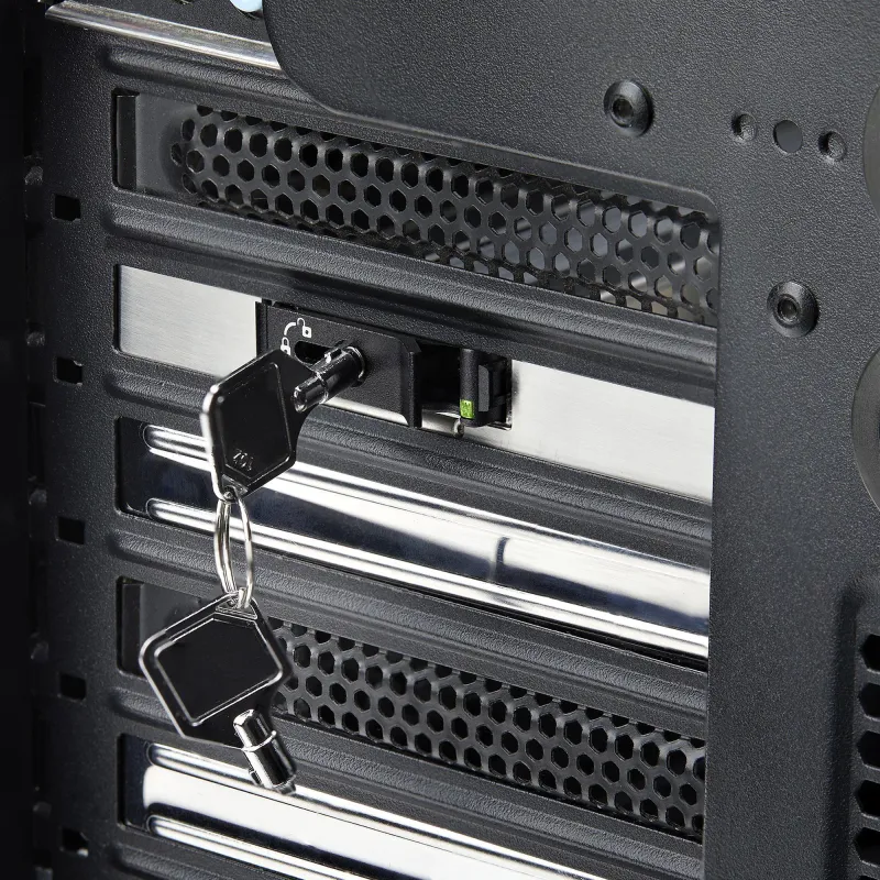 INSTALACIÓN SIN HERRAMIENTAS: Instale una unidad M.2 en la bandeja de la Unidad e inserte la bandeja en la bahía de la unidad, sin necesidad de herramientas. La bandeja para unidades cuenta con un indicador LED de encendido/actividad para supervisar el estado de la unidad. Un mecanismo de bloqueo con cerradura opcional (2 llaves incluidas) disuade del robo de dispositivos de almacenamiento de datos de misión crítica.