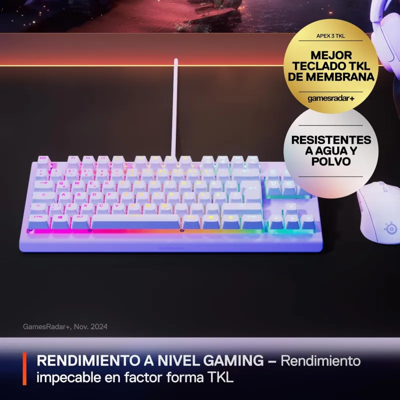 El SteelSeries Apex 3 TKL lavanda (US) es un teclado tenkeyless (sin numpad) pensado para jugar con más libertad de ratón en escritorios reales: mesas pequeñas, setups compartidos o usuarios de sensibilidad baja en shooters.
