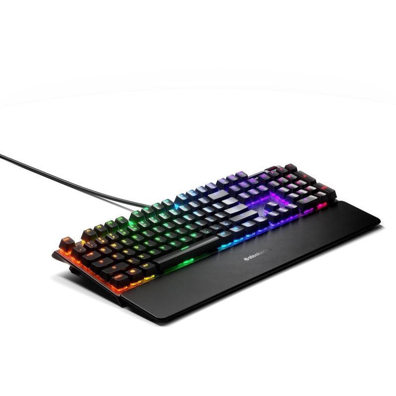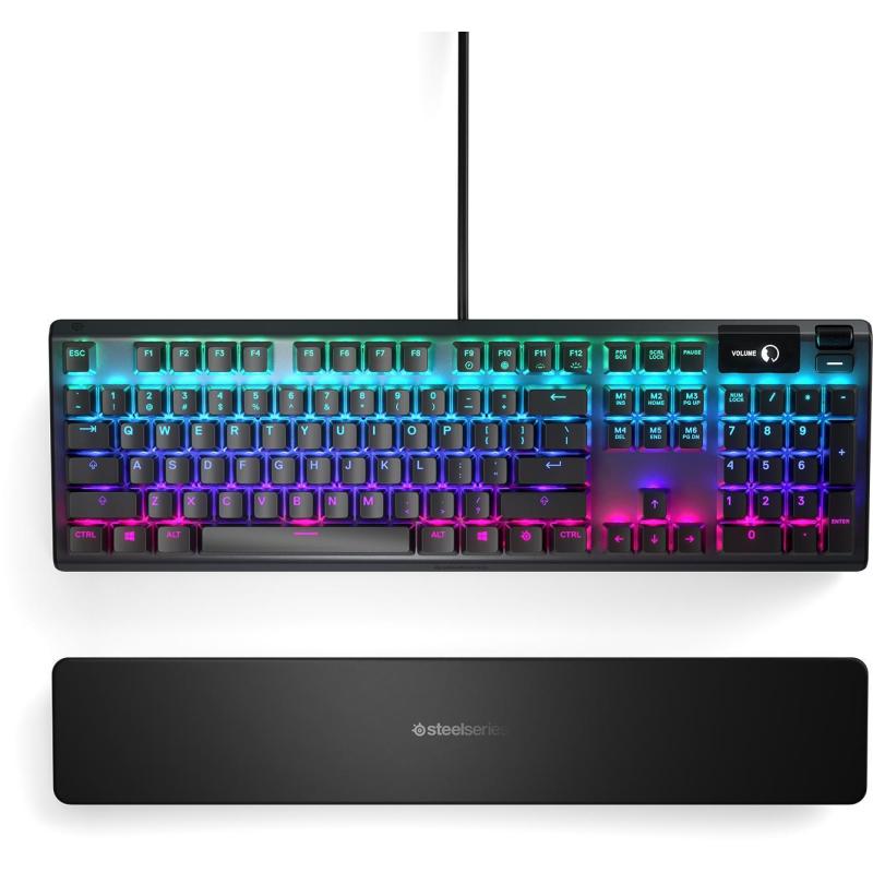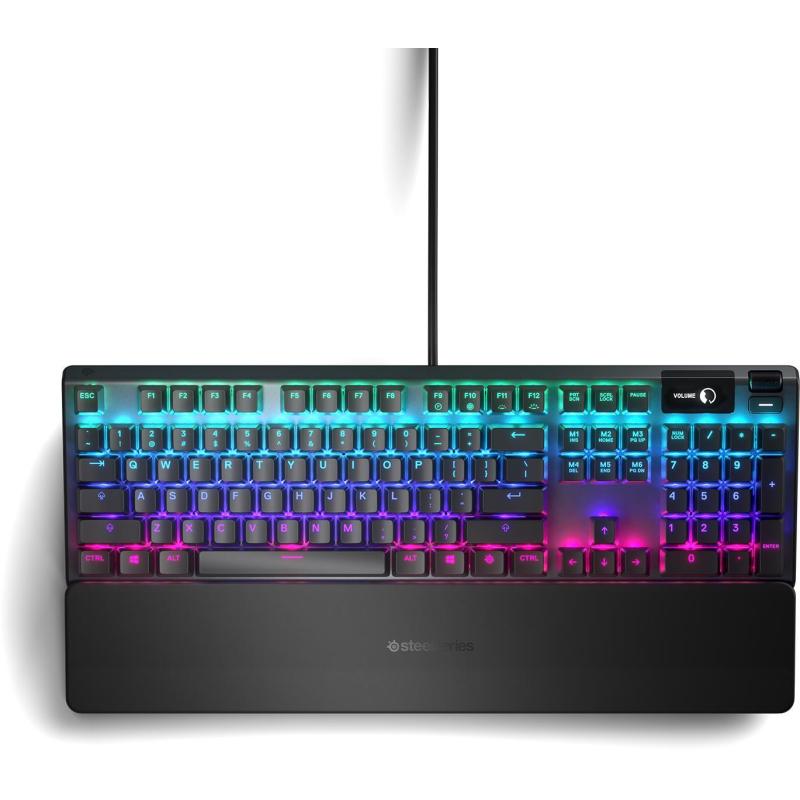 Teclado SteelSeries Apex 5 con cable, retroiluminación RGB, interruptores mecánicos híbridos Blue, pantalla OLED y reposamuñecas magnético