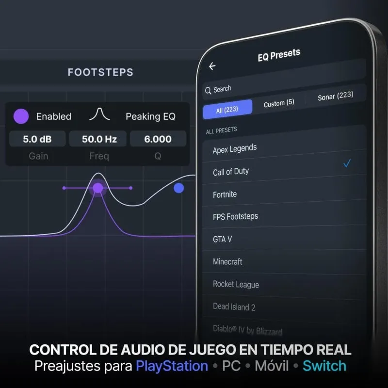 • Empareja el móvil por Bluetooth 5.0 para llamadas, chat o música mientras sigues jugando con el canal 2,4 GHz.