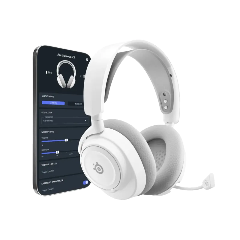 SteelSeries Arctis Nova 7X Wireless Gen 2 Blanco combina 2.4 GHz y Bluetooth simultáneo para jugar, chatear y alternar dispositivos sin cables.