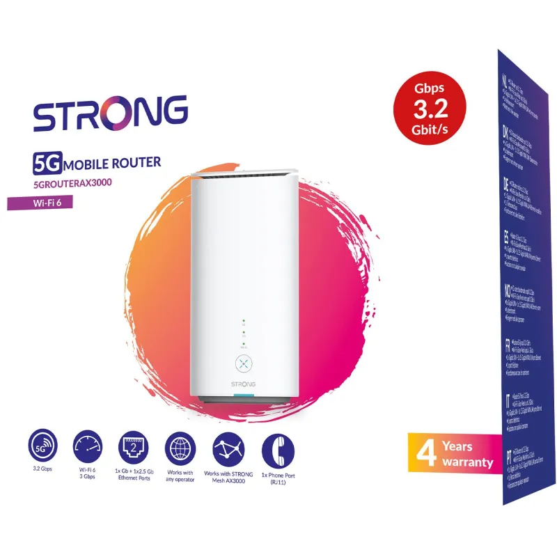 Router con Red Móvil Strong 5G AX3000 con Wi-Fi 5 (802.11ac), conectividad Gigabit Ethernet y soporte para redes móviles 5G y 4G LTE.