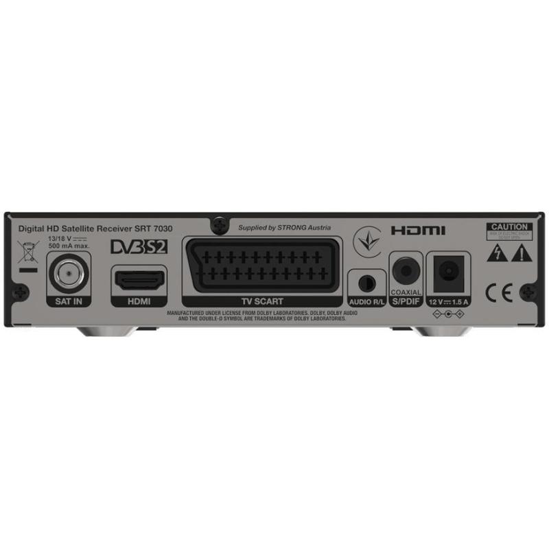 Decodificador Strong SRT7030 con decodificadores Dolby Digital Plus, puerto HDMI 1.3 y compatibilidad con señales HD vía satélite y grabación USB
