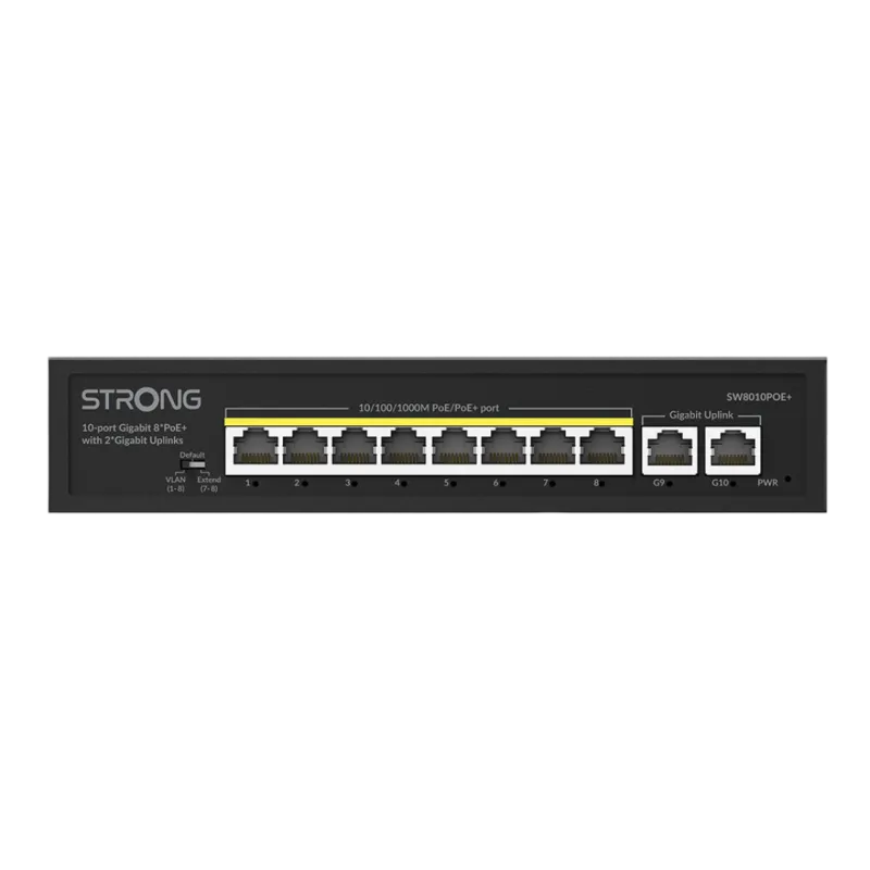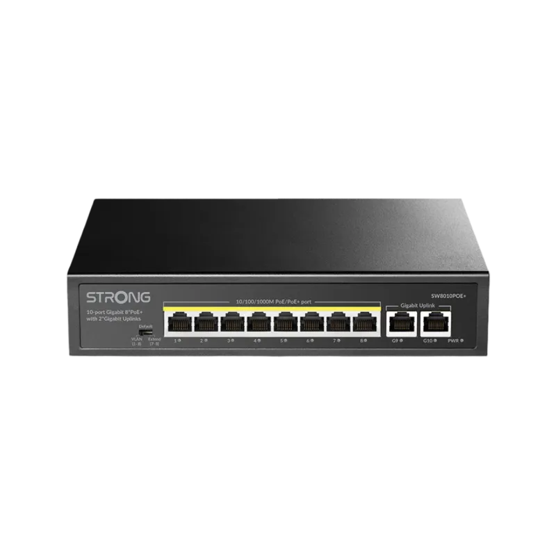 Switch Strong SW8010POE+ 8 puertos PoE para cámaras IP y redes pequeñas, con 2 uplink Ethernet y gestión sencilla para oficinas y PYMEs.