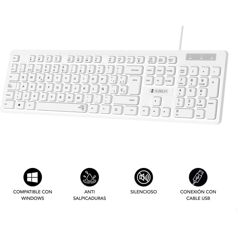 Teclado Subblim Business Slim Silencioso con diseño QWERTY Español Diseño completo en color Blanco, teclas silenciosas.