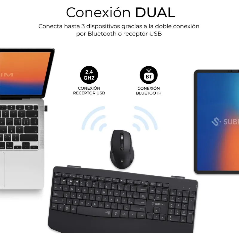 COMPATIBILIDAD TOTAL Y FÁCIL CONFIGURACIÓN: El Teclado con ratón Subblim COMBO DUAL OFFICE PROWAVE BLACK es totalmente compatible con los principales sistemas operativos del mercado. Funciona con Windows 10 y 11, así como con las versiones más recientes de Mac OS, incluyendo Big Sur, Monterey, Ventura y Sonoma. También es compatible con Android e iPadOS, lo que lo convierte en una herramienta ideal para usuarios que alternan entre dispositivos. La conectividad Bluetooth 5.3 y la función Plug and Play facilitan una configuración rápida y sin complicaciones. Además, su batería 800mAh en el teclado ofrece una autonomía superior respecto a modelos convencionales. El contenido del embalaje incluye todo lo necesario para empezar a usarlo de inmediato, incluyendo receptor USB tipo A y manual en español.