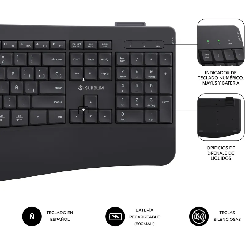 Teclado con ratón Subblim COMBO DUAL OFFICE PROWAVE BLACK inalámbrico ergonómico con Bluetooth 5.3 batería recargable