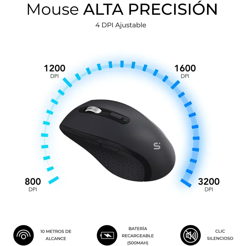 Este combo también incluye un ratón inalámbrico diseñado para usuarios diestros, con resolución de hasta 3200 DPI y seis botones funcionales, incluyendo funciones de avance, retroceso y scroll clicable. Ambos dispositivos cuentan con batería integrada recargable mediante puerto USB tipo C, destacando el teclado con su batería 800mAh y el ratón con 500mAh, ofreciendo una autonomía prolongada sin necesidad de pilas externas. El alcance inalámbrico de hasta 10 metros garantiza libertad de movimiento. Este conjunto también cumple con certificaciones CE y RoHS, asegurando sostenibilidad y calidad. El Teclado con ratón Subblim COMBO DUAL OFFICE PROWAVE BLACK es una solución eficiente, moderna y cómoda para cualquier entorno de trabajo.