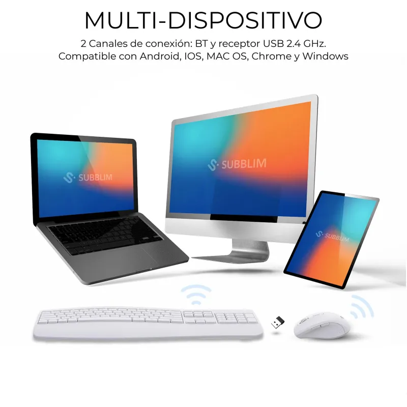COMPATIBILIDAD AMPLIA Y CERTIFICACIONES DE CALIDAD: El Teclado con ratón Subblim COMBO DUAL OFFICE PROWAVE WHITE es compatible con los principales sistemas operativos del mercado, incluyendo Windows 10 y 11, Mac OS X desde Big Sur hasta Sonoma, así como Android e iPadOS. Esta compatibilidad amplia lo convierte en una opción ideal para entornos de trabajo híbridos o usuarios con múltiples dispositivos. Además, cuenta con certificaciones CE y RoHS, lo que garantiza su conformidad con las normativas europeas de seguridad y sostenibilidad. Un producto fiable, eficiente y respetuoso con el medio ambiente.