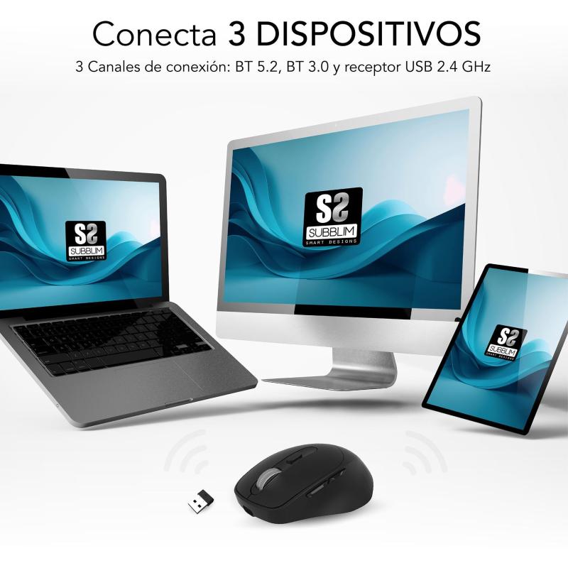 CONEXIÓN DUAL PARA MÁXIMA VERSATILIDAD: Con Bluetooth 5.2 y USB tipo A, conecta tu ratón fácilmente a cualquier dispositivo, ya sea un ordenador, smartphone o tablet.