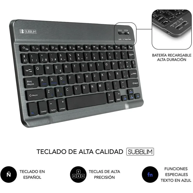 TECLADO BLUETOOTH EXTRAÍBLE: Este Teclado Bluetooth extraíble viene con una funda de alta calidad compatible con todas las Tablet del mercado de 9 a 10,1”. Se conecta a la perfección con cualquier dispositivo compatible con la tecnología Bluetooth para una escritura más rápida y cómoda. Un mecanismo de resorte debajo de cada tecla asegura una respuesta táctil con cada golpe, lo que le ayuda a escribir más rápido y con menos errores que en una pantalla táctil. El diseño de la funda Ultradelgada agrega la máxima protección con un volumen mínimo. Encuentra el ángulo adecuado en modo horizontal con el soporte ajustable que se personaliza según sus preferencias personales de visualización. Se puede acceder a todas las funciones de la Tablet incluso con la funda puesta. Esta funda versátil y protectora de Subblim presenta un teclado extraíble que le permite cambiar entre el trabajo y el juego con facilidad en cualquier lugar donde lo uses.