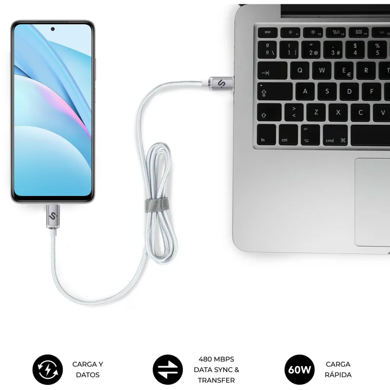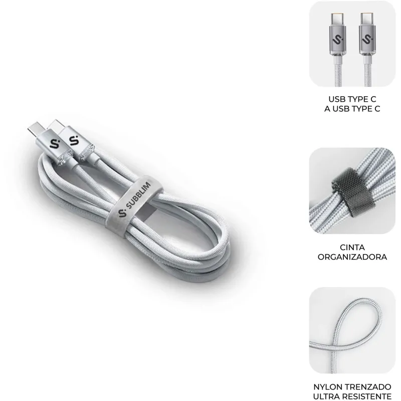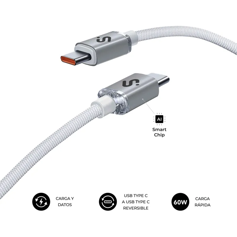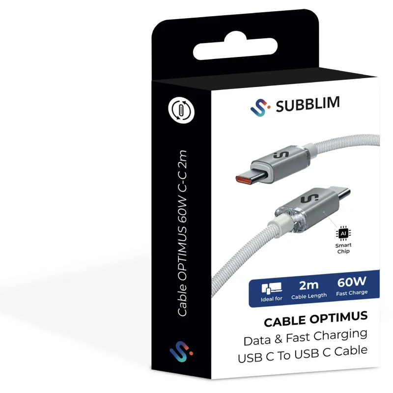 Cable USB Subblim OPTIMUS 60W 2M Blanco con carga rápida 60W, longitud de cable 2 metros, conectores reversibles y material resistente