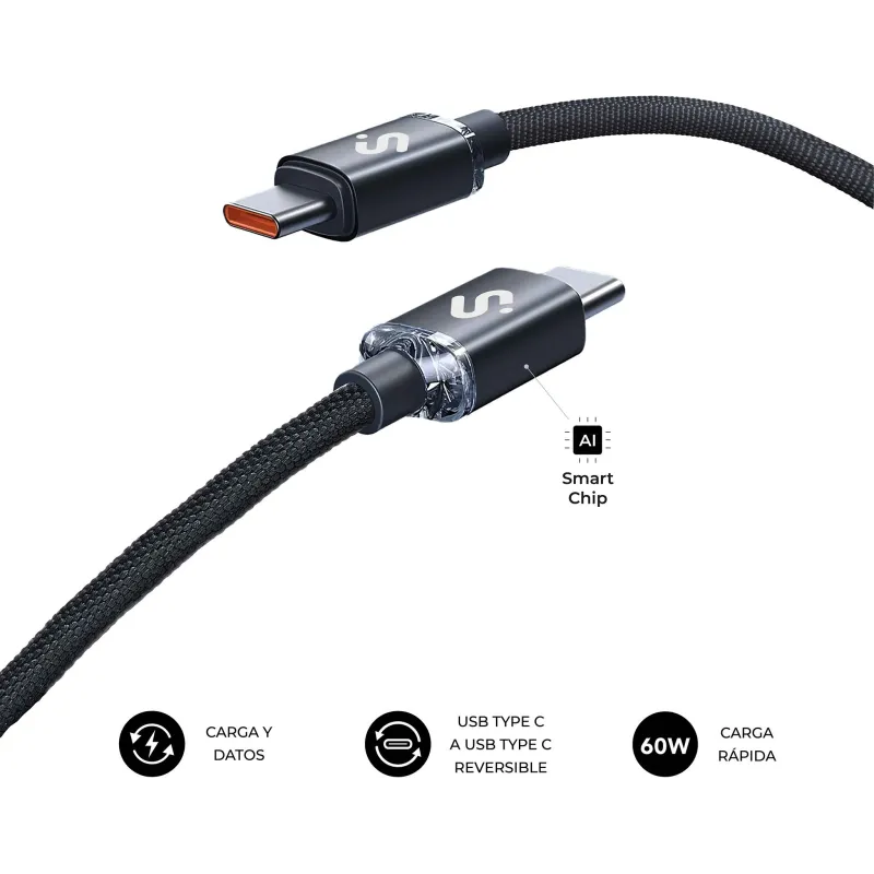 Cable USB Subblim Optimus SUBCAB-C06001 con entrega de energía 60W, tasa de transferencia 0,48 Gbit/s y conectores USB-C reversibles