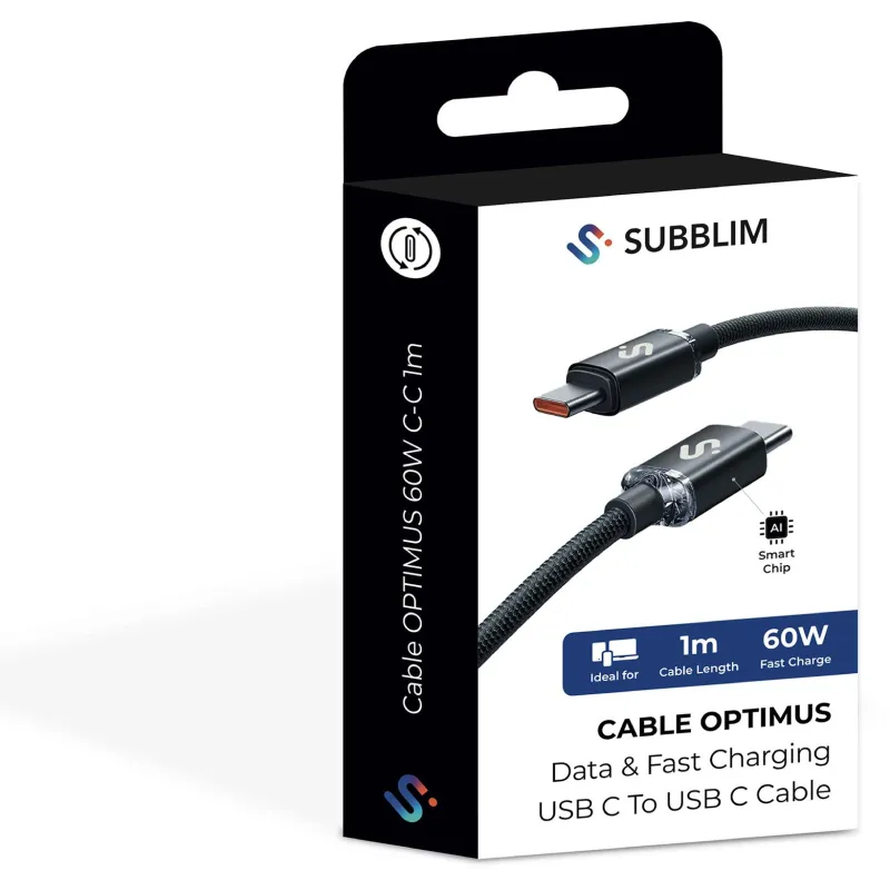 PRESENTAMOS EL CABLE SUBBLIM USB C A USB C “OPTIMUS” DE 1M: Presentamos el cable SUBBLIM USB C a USB C “Optimus” de 1m, la solución ideal para quienes buscan un cable capaz de ofrecer carga rápida de hasta 60W (20V/3A) y una velocidad de transferencia de datos de 480Mbps. Gracias a su fabricación con nylon trenzado de alta densidad y conectores de aluminio, este cable garantiza durabilidad y un rendimiento confiable en cada uso.