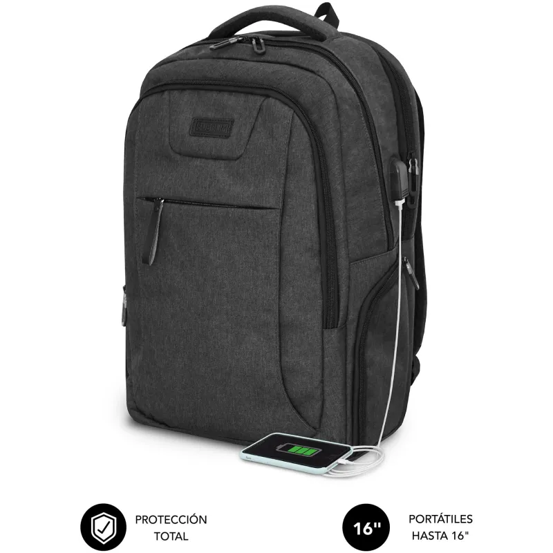 Mochila para Portátil Subblim SUBBP-4PA2100 con puerto USB, múltiples bolsillos y capacidad para portátiles de hasta 16 pulgadas, en color negro.