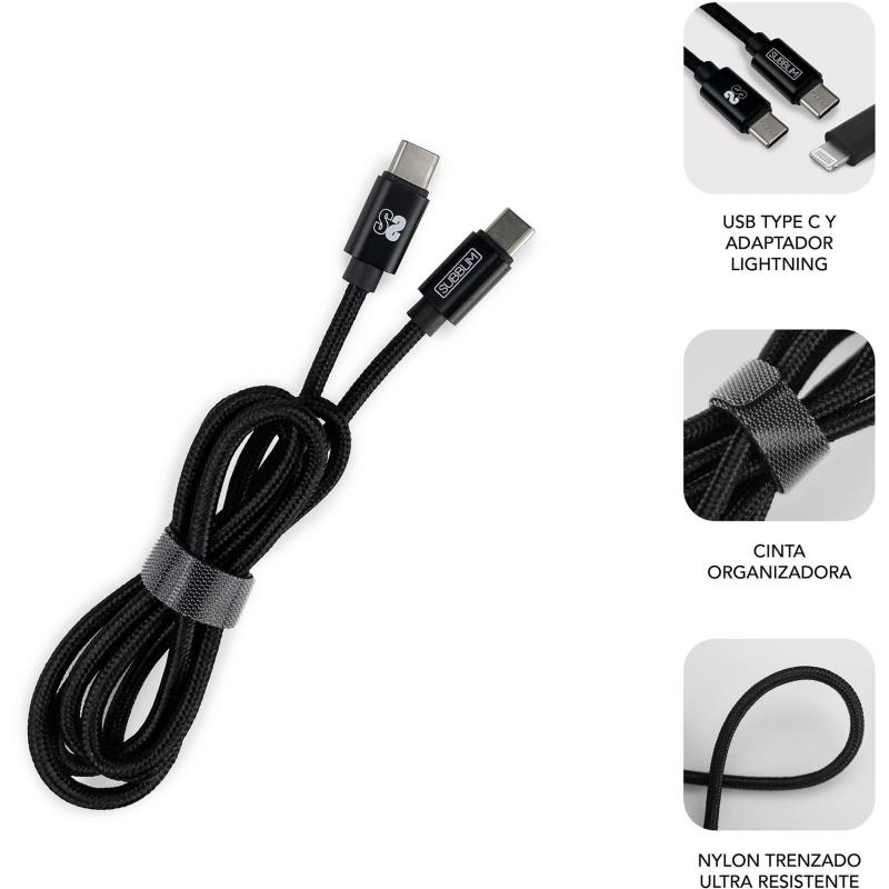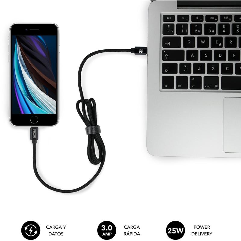 CABLE DE CARGA Y TRANSFERENCIA DE DATOS: Gracias al cable de altas prestaciones con conector USB C y adaptador Lightning podrás cargar de forma ultra rápida los dispositivos compatibles con esta tecnología. Con los conectores metálicos mate y cubierta exterior trenzada este cable cuenta con un aspecto que es a la vez elegante y moderno. Diseñado para soportar un uso intenso el cable USB C es idóneo para tu estilo de vida activo y móvil. Incluye un organizador de cable para llevarlo siempre recogido y protegido. Ha sido sometido a ensayos de dobladura de 90° hasta un total de 10.000 veces.