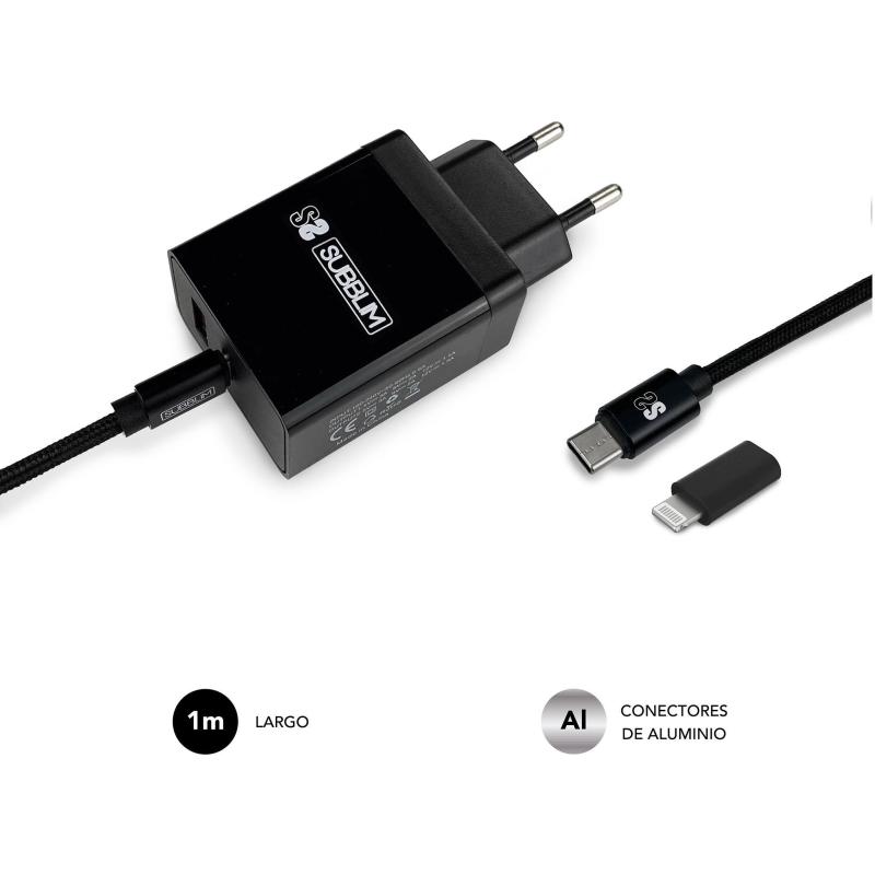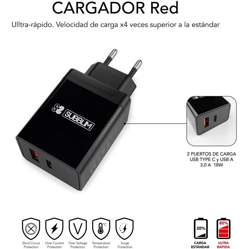 Cargador de Móvil Subblim SUBCHG-3WPD11 Carga Rápida de 25W con Quick Charge 3.0 USB-C protección avanzada, color Negro.