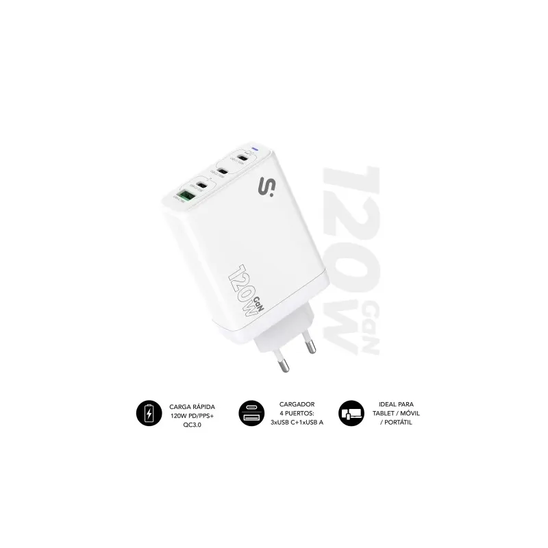 Cargador Subblim SUBCHG-6G1204 con potencia 120W, tres puertos USB-C Power Delivery y un puerto USB-A, carga rápida y conexión a corriente alterna.
