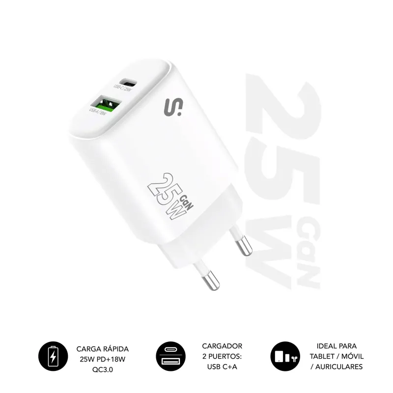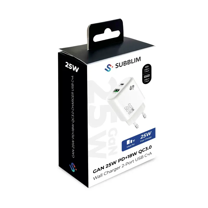 Cargador de Móvil Subblim SUBCHG-6G2510 con tecnología GaN, entrega de energía USB 25 W y carga rápida para dispositivos compatibles