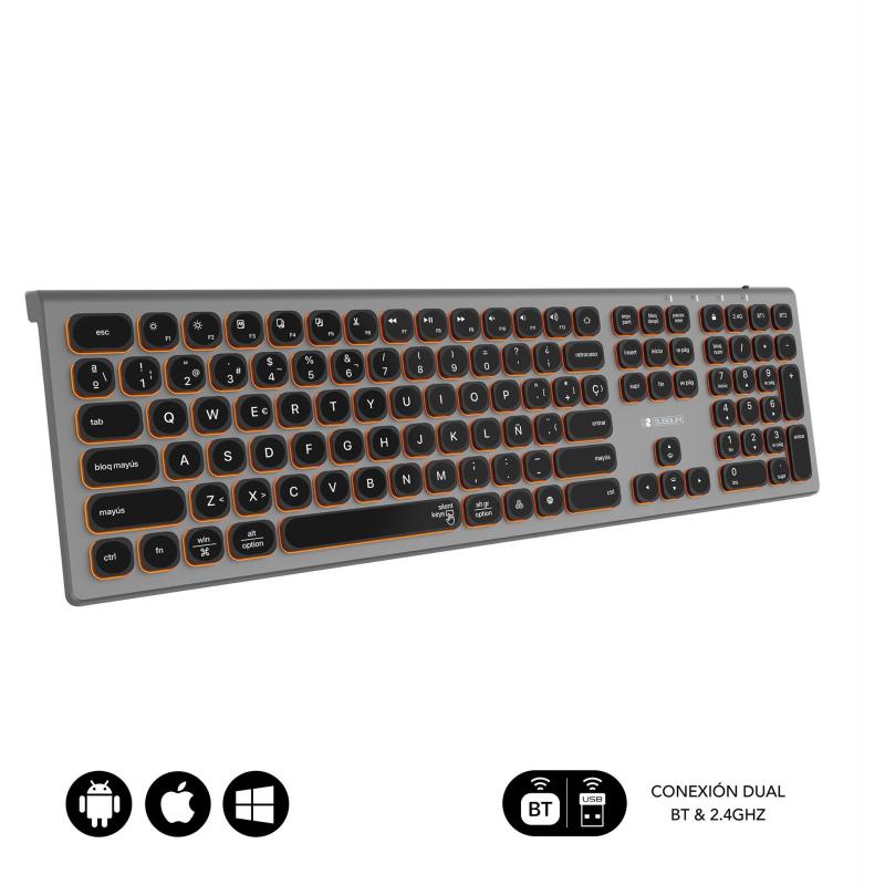 COMPLETA TU ESPACIO DE ESCRITORIO MODERNO: Completa tu espacio de escritorio moderno, mientras trabajas de forma remota o desde casa, con el teclado retroiluminado Bluetooth SUBBLIM Master. Diseñado para dispositivos con sistemas Mac/iOS, Windows o Android, el teclado Master cuenta con un diseño ampliado con teclado numérico, Bluetooth y 2.4G multidispositivo y teclas de acceso directo optimizadas para varios sistemas, todo con un diseño ultradelgado y moderno. Equipado con teclas cóncavas retroiluminadas ajustables y un puerto USB-C recargable, el teclado permite trabajar con facilidad donde y cuando te lleve tu creatividad.
