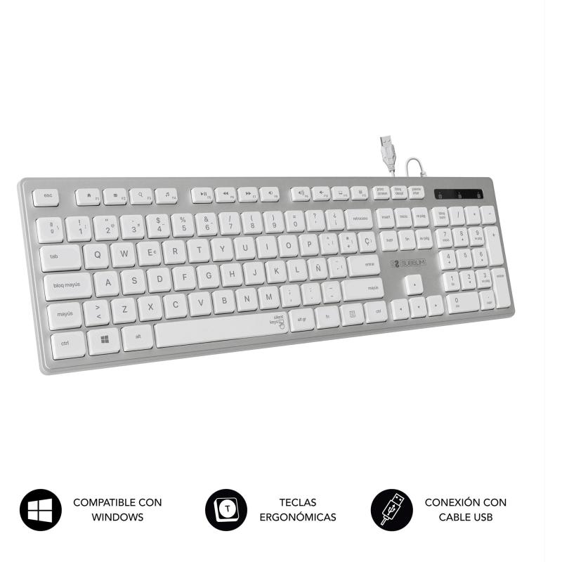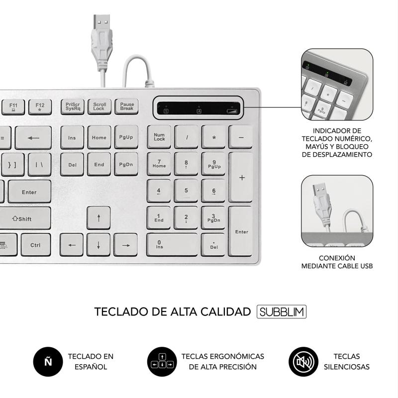 TECLADO ERGONÓMICO Y SILENCIOSO: El teclado con cable USB SUBBLIM ERGO, te proporciona una precisa y confortable escritura gracias a su ergonomía en las teclas cóncavas. Además, tu escritorio será mucho más elegante por su combinación de colores que harán juego con el resto de elementos creando un espacio de trabajo ideal. Todo ello sin ruidos incómodos gracias a la tecnología Silent Keys utilizada en las teclas.