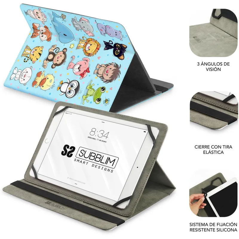 PROTECCIÓN EFICAZ Y DISEÑO FUNCIONAL PARA TU TABLET: La Funda para tablet Subblim Trendy Case Animals ofrece una combinación perfecta entre diseño y funcionalidad. Fabricada en material poliuretano, garantiza una protección óptima contra arañazos y salpicaduras de agua, sin sacrificar la estética. Gracias a sus tres modos de soporte, puedes ajustar la posición de la tablet según tu necesidad, ya sea para escribir, leer o ver vídeos. Su cierre con cuerda elástica proporciona seguridad adicional, permitiendo un uso diario cómodo y fiable. Compatible con cualquier marca, esta funda se adapta a dispositivos de hasta pantalla 11 pulgadas, ofreciendo versatilidad sin límites.