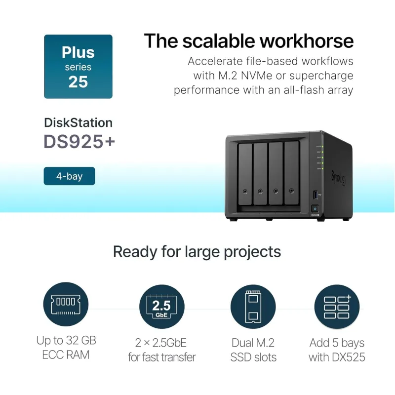 Sistema NAS Synology DS925+ con procesador AMD Ryzen V1500B, admite hasta 180 TB de almacenamiento, 9 unidades y conectividad Ethernet de 2,5 Gb/s