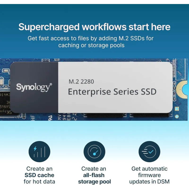 CONEXIÓN 2.5GBE Y OPCIONES DE ALMACENAMIENTO DIVERSAS: El DS925+ cuenta con conectividad 2.5GbE integrada y es compatible tanto con unidades flash SATA como con discos duros (HDD) en bahías internas de 2.5"/3.5", así como con unidades M.2 NVMe a través de ranuras M.2 para su uso como caché o grupos de almacenamiento.