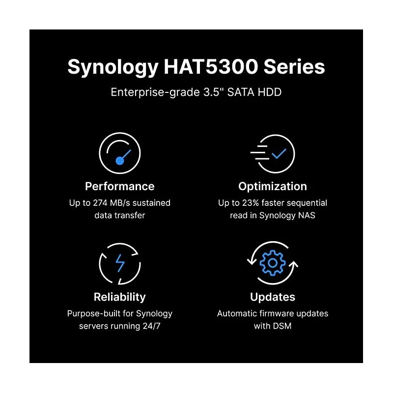 AMPLIACIÓN CON CONFIANZA: Las unidades de la serie HAT5300 de Synology se han diseñado para proporcionar un rendimiento rápido y fiable, incluso para un gran número de clientes. El firmware y el software colaboran para garantizar el máximo rendimiento, ofreciendo un rendimiento de lectura secuencial un 23 % superior al de unidades de capacidad similar. La serie HAT5300 proporciona un rendimiento excepcional para videovigilancia a gran escala, posproducción multimedia y entornos de servidores de archivos empresariales.