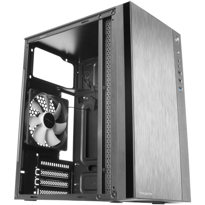 El chasis soporta una altura máxima de CPU de 16 cm y una longitud máxima de tarjeta gráfica de 26 cm, asegurando compatibilidad con componentes de alto rendimiento. Además, incluye puertos de entrada y salida de audio, 2 puertos USB 2.0 y 1 puerto USB 3.2 Gen 1, garantizando conectividad moderna y rápida.