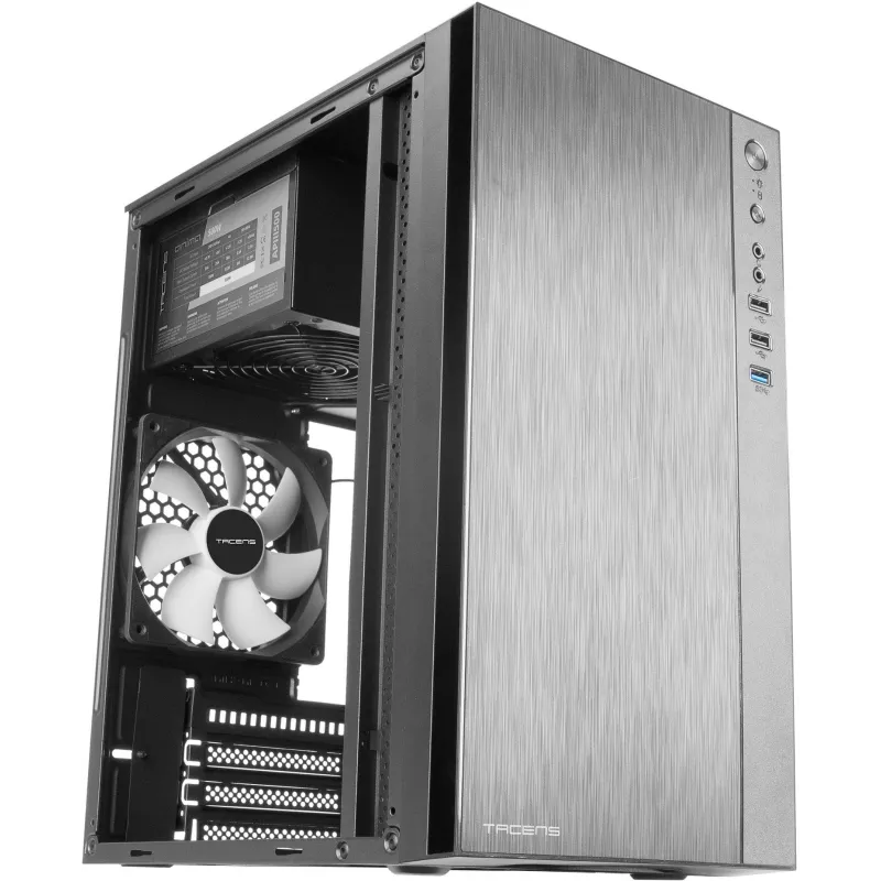 La fuente de alimentación de 500 W incluida es compatible con factores de forma ATX y cuenta con un conector ATX (20 + 4 pin) y 2 conectores SATA. En cuanto a puertos e interfaces, ofrece entrada y salida de audio, 2 puertos USB 2.0 y 1 puerto USB 3.2 Gen 1 tipo A. El sistema de enfriamiento admite hasta 2 ventiladores frontales de 120 mm y viene con 1 ventilador trasero de 120 mm preinstalado.