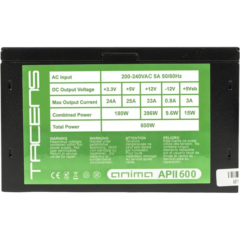 ENERGÍA SIN LÍMITES: Con una potencia total de 600 W y un voltaje de entrada AC que oscila entre 220 y 240 V, asegura un suministro constante y eficiente. Sus parámetros de frecuencia de entrada AC, que varían de 50 a 60 Hz, y una corriente de entrada de 5 A, proporcionan una base sólida para cualquier configuración informática. La potencia combinada de 180 W a 3,3 V y de 396 W a 12 V, junto con los 180 W a 5 V, garantizan una distribución energética óptima entre componentes.