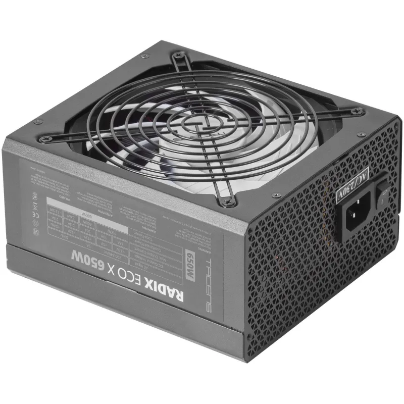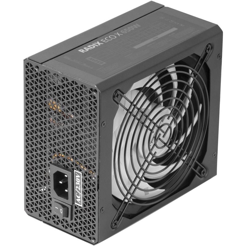 FUENTE DE ALIMENTACIÓN RADIX ECO X 650: 6 años de garantía gracias a la última tecnología de fabricación SMD de alta precisión, PCB de doble capa de fibra de vidrio y componentes grado-A de fiabilidad total. Silencio máximo con la nueva tecnología AI-RPM y ventilador XL de 140mm. 99% eficiencia DIGITAL APFC, 87% de eficiencia eléctrica, cables planos negros extra-largos y 10 sistemas de protección y seguridad incluidos.