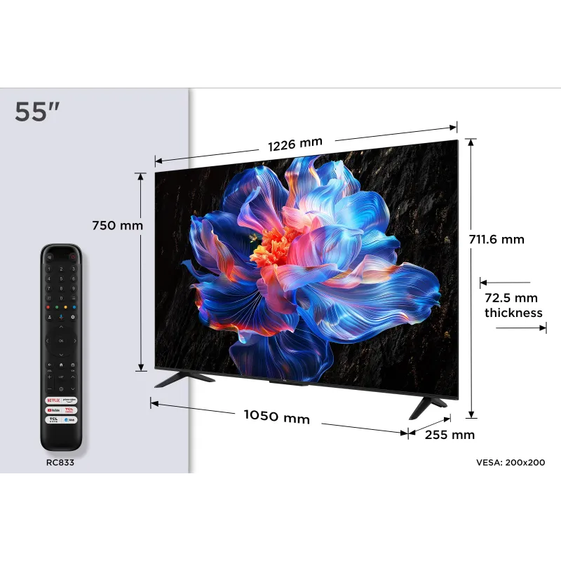 DISEÑO MODERNO Y FUNCIONALIDAD AVANZADA: El Televisor Tcl P6k 55P6K destaca no solo por su rendimiento, sino también por su diseño inteligente y funcional. Su estructura sin marco y acabado metálico aportan un aspecto elegante y minimalista. La compatibilidad con montaje VESA de 200x200 mm facilita su instalación en pared, mientras que su base de patas ofrece estabilidad. Además, incluye un mando a distancia con soporte para control por voz, compatible con Amazon Alexa y Google Assistant. El Televisor Tcl P6k 55P6K está diseñado para adaptarse a tu estilo de vida digital, combinando estética, tecnología y comodidad en un solo dispositivo.